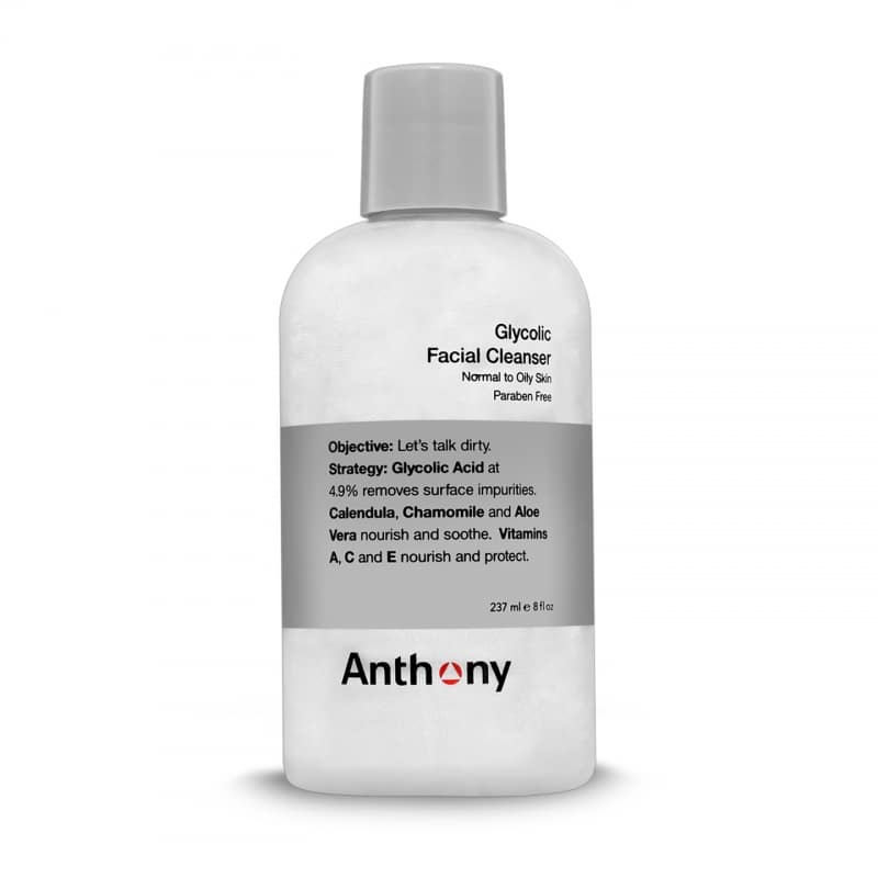- Der parabenfreie Glycolic Facial Cleanser von Anthony enthält 4.9% Glycolsäure, welche Unreinheiten von der Hautoberfläche beseitigt und eine porentief gereinigt Haut hinterlässt ohne ihr Feuchtigkeit zu entziehen.